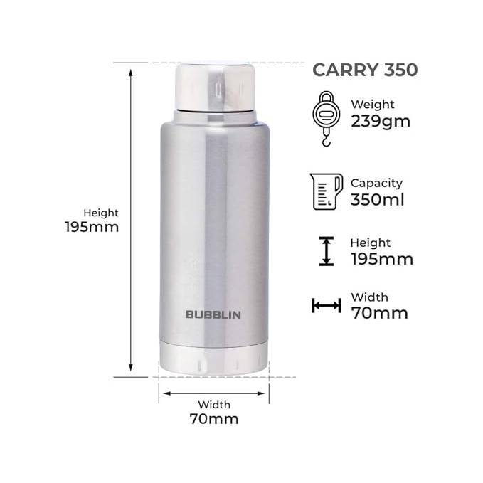 Bubblin water bottle is made from 18/8 stainless steel. This insulated double walled vacuum water bottle is designed for maximum temperature retention that keeps your favourite drinks hot/cold without altering their temperatures for a prolonged period of time. It will keep your drinks just the way you need them throughout the day. The taste and nutritive value of the drinks remains intact for a long time making the bottles very appropriate choice for storing beverages.Carry bottle is 304 grade stainless steel vacuum bottle which is rust free and its plastic Lid is made of food grade material and is BPA free. The stylish exterior and color combination makes this bottle a must have. Bubblin as a Brand in the industry has flourished as a manufacturer of household products. Over the years since its inception in 2008, the company has focused its activities on manufacturing of household goods and has entered the market with a range of world class products that includes Stainless Steel Vacuum Bottles, Sport Bottles, Flasks, Sippers, Food containers & Lunch Boxes, Double Wall Mugs, Steel Fridge Bottles, Borosilicate Glass Bottles and many more products.With its motto “Survival by Quality and Development by innovation” company served to anticipate and provide consumers with high eminence and resilient products that can enhance individuals day to day life.