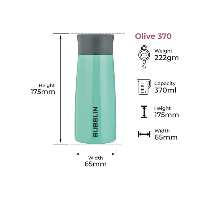 Bubblin water bottle is made from 18/8 stainless steel. This insulated double walled vacuum water bottle is designed for maximum temperature retention that keeps your favourite drinks hot/cold without altering their temperatures for a prolonged period of time. It will keep your drinks just the way you need them throughout the day. The taste and nutritive value of the drinks remains intact for a long time making the bottles very appropriate choice for storing beverages.Olive bottle is 304 grade stainless steel vacuum bottle which is rust free and its plastic Lid is made of food grade material and is BPA free. The stylish exterior and color combination makes this bottle a must have.