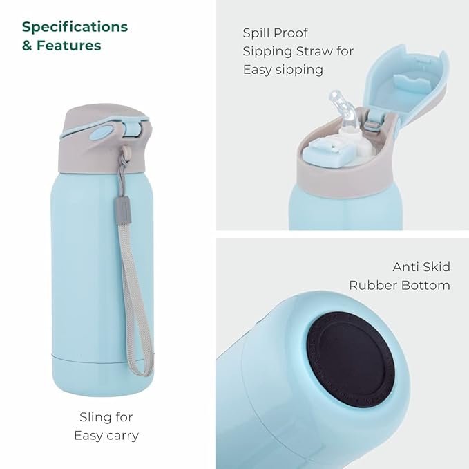• Perfect Size, Easy to carry , Condensation free and Leak Proof Lid. Sling for easy carry, Spill proof with sipping straw and Anti-Skid Bottom.