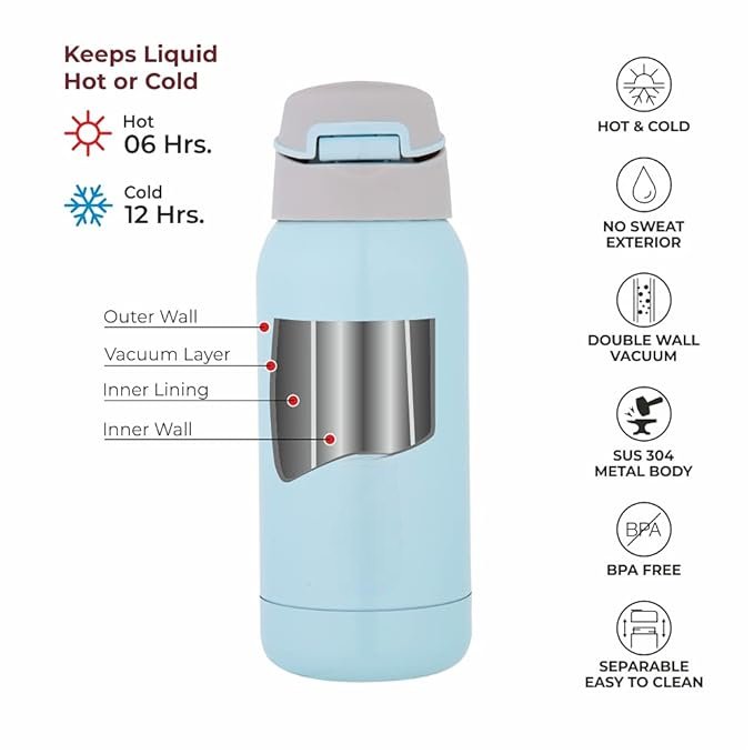 • Material: Stainless steel 304 grade; Insulation Type: Double Wall Vacuum Insulated Water Bottle Capacity -450 ML, Inner and Outer side of Bottle is Made from 304 Grade Steel Which is Rust Free and 100% Food Grade.