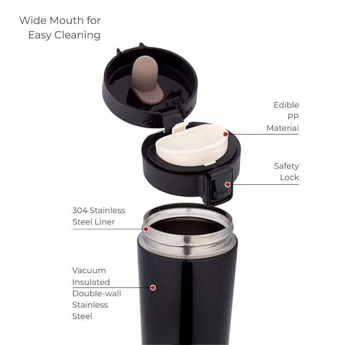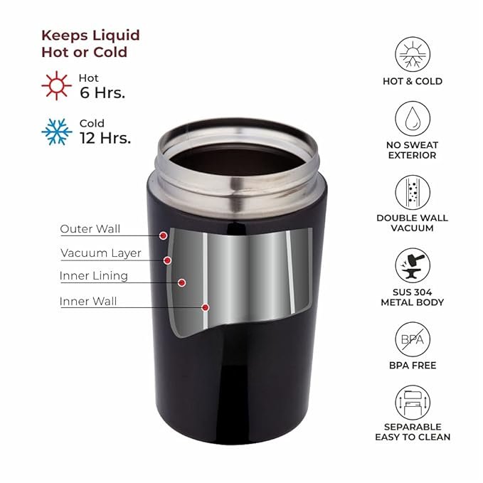 - Insulation type: Double wall; Temperature retention: Yes ; No sweat Exterior (Keeps liquid hot/cold upto 6 hrs hot 12 hrs cold); Leak proof: Yes; Wide Mouth for easy cleaning