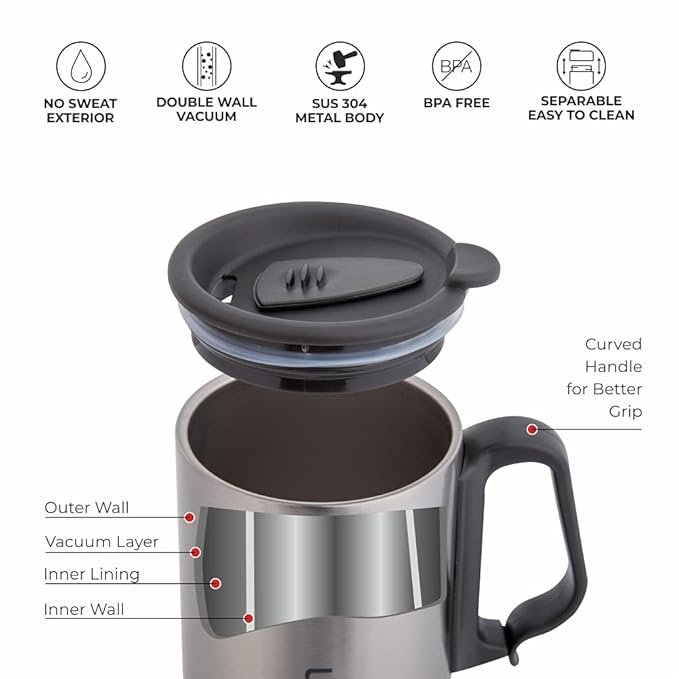 - Inner and Outer side of mug is made from 304 Grade Steel which is Rust Free and 100% Food Grade.