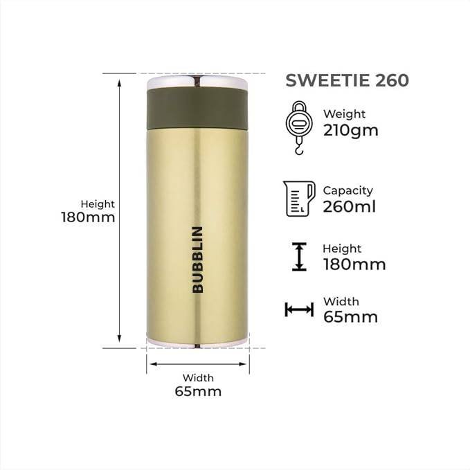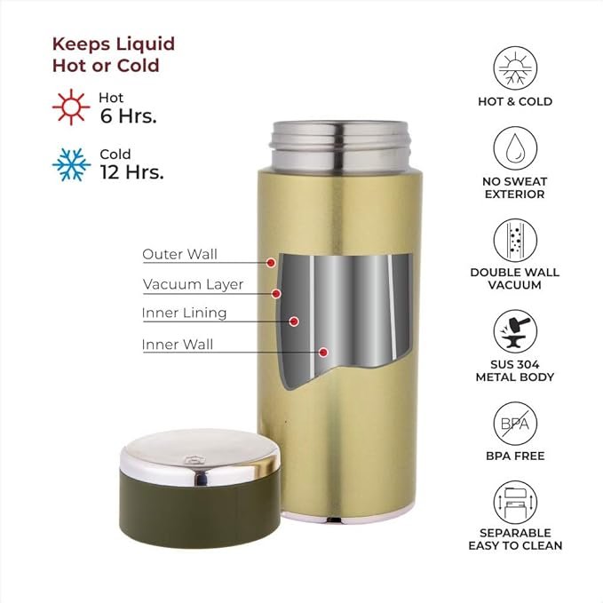 - Double Wall Vacuum Insulated Water Bottle Capacity – 260 ML, Inner and Outer side of Bottle is Made from 304 Grade Steel Which is Rust Free and 100% Food Grade.